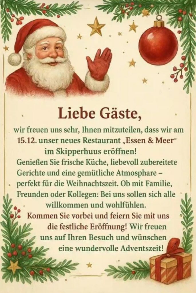 Unser Restaurant „Essen & Meer“ wird unter der neuen Führung von Ramon und Emrah am 15. Dezember 2025 feierlich neu eröffnet 🥳.