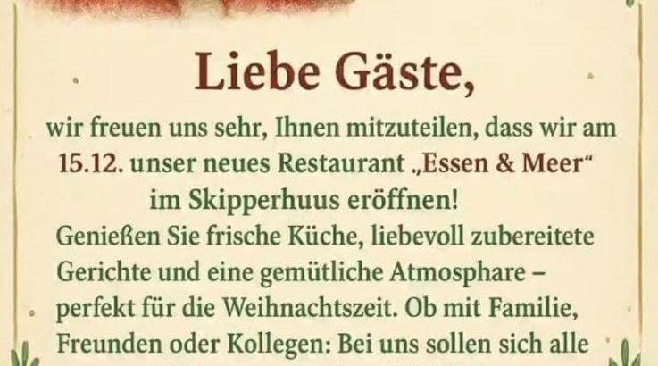 Unser Restaurant „Essen & Meer“ wird unter der neuen Führung von Ramon und Emrah am 15. Dezember 2025 feierlich neu eröffnet 🥳.